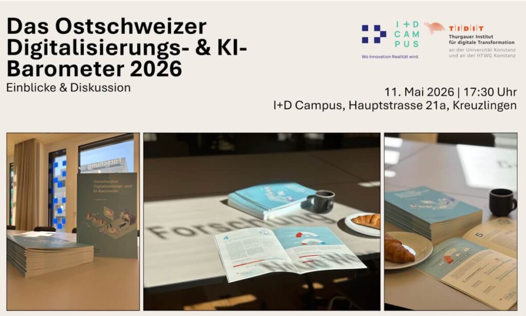 Das Thurgauer Institut für Digitale Transformation (TIDIT) und der I+D Campus laden Sie herzlich ein, gemeinsam die digitale Zukunft der Ostschweiz zu diskutieren: Während der I+D Campus als Innovations- und Begegnungsort Raum für Austausch und Vernetzung bietet, bringt das TIDIT wissenschaftlich fundierte Einblicke in die digitale Transformation und Künstliche Intelligenz ein.